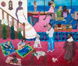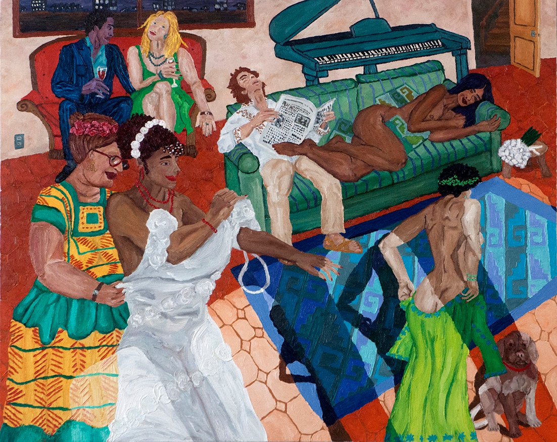Ya la vida me lo había mostrado cuando visité por primera vez Chacahua en un viaje de generación de la Esmeralda. Y aunque el primer cuadro que hice lo pinté de lo que vi ahí, la experiencia en Collantes fue muy distinta. Tenía claro que conceptualmente, en la temática y en la pintura, no me interesa retratarlos, imagínate si me pongo hacer cuadros de ellos pescando, o haciendo cualquier otra cosa, eso pueden verlo en fotografías, pero me interesa mucho más. En la pintura se le llama “idealización” a esto que básicamente es crear realidades imposibles. Si en este cuadro hubiera puros blanquitos, sería normal, no tendría ningún sentido. Lo interesante es que lo puedas juntar a los genotipos, a ese conjunto de información genética que nos conforma. Porque en Oaxaca somos una gran diversidad: el blanco, el mestizo y el indio, y ahora el negro. ¡Faltaba el genotipo del negro!