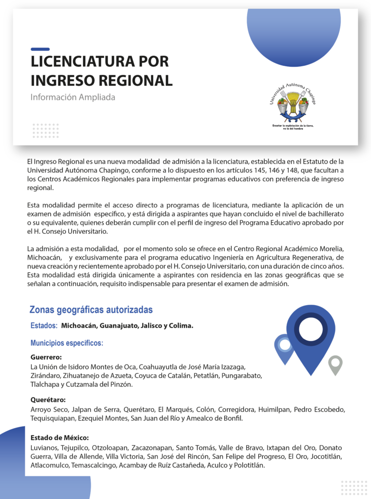 - Ingreso regional (nueva modalidad): a diferencia de las modalidades de alcance nacional (Preparatoria Agrícola y Propedéutico), que están abiertas a aspirantes de todo el país, la opción de ingreso regional está dirigida a jóvenes con residencia comprobable en zonas geográficas específicas vinculadas al Centro Académico Regional de Morelia, Michoacán.