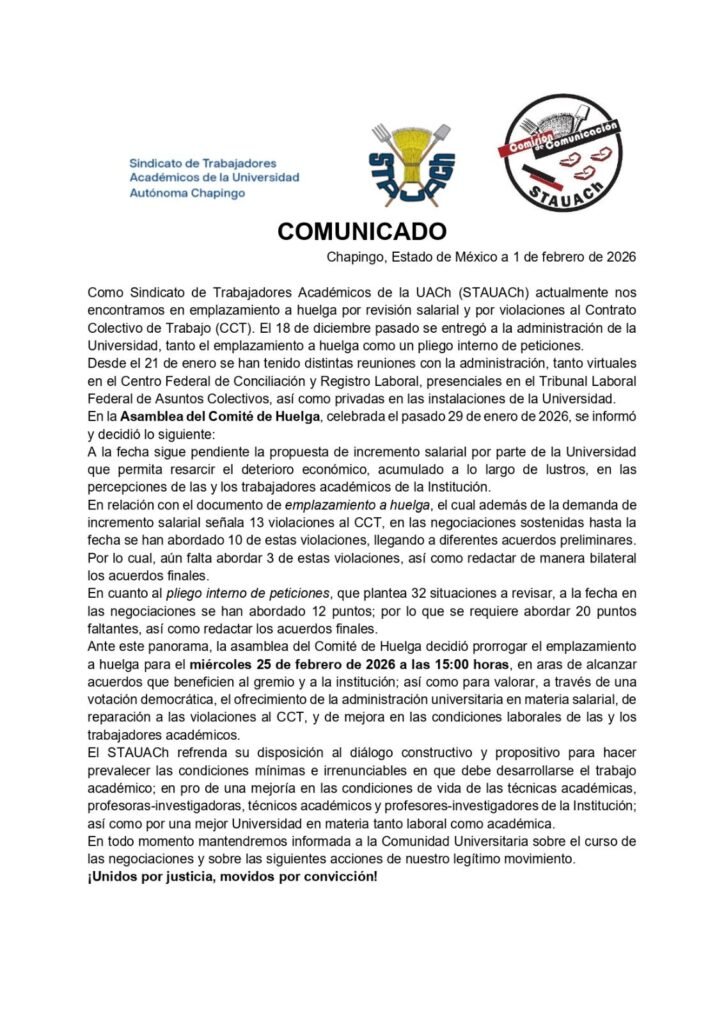 El Comité de Huelga del Sindicato de Trabajadores Académicos de la Universidad Autónoma Chapingo (STAUACh) prorrogó el emplazamiento a huelga hasta el próximo 25 de febrero, con el objetivo de continuar las negociaciones y buscar acuerdos con la administración universitaria, informó la organización sindical mediante un comunicado.